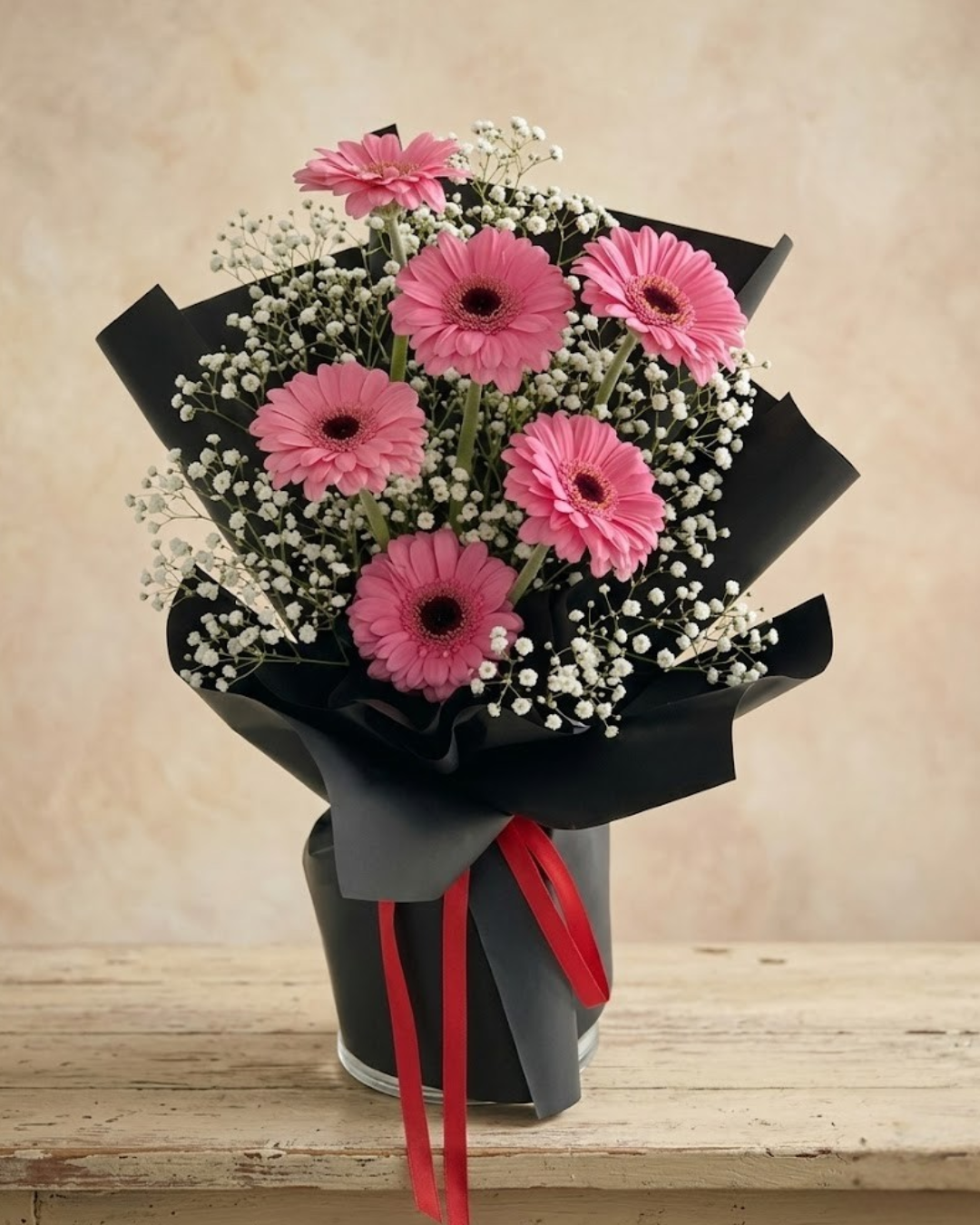 Este es un arreglo moderno y de alto contraste, compuesto por gerberas de un color rosa realzadas por una delicado faollaje de chispas blancas. El ramo está envuelto en un papel negro profundo que resalta la intensidad de los pétalos, logrando una estética sofisticada y llamativa. El diseño se completa con un listón de satén rojo delgado, ideal para un regalo con personalidad que combina elegancia y frescura.