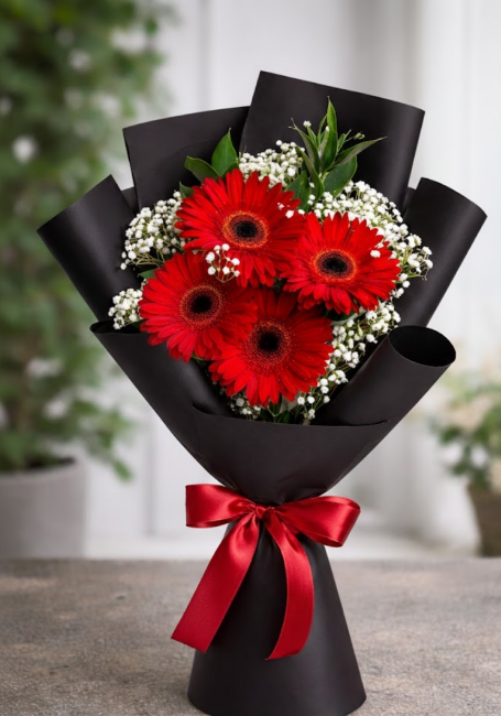 Un arreglo directo y lleno de energía. Cuatro gerberas rojas de gran apertura descansan sobre un fondo negro profundo, acompañadas de delicada gypsophila (nube). Es un detalle contemporáneo, perfecto para expresar admiración y alegría sin complicaciones.