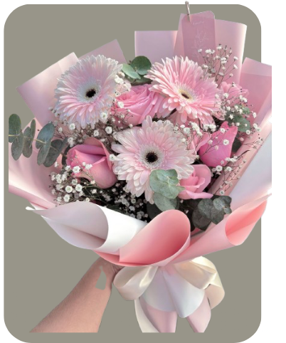 Arreglo floral con gerberas rosadas de pétalos suaves, rosas rosa pastel y delicadas follaje de chispas blanca, que aportan ligereza y volumen. Se complementa con follaje de eucalipto, añadiendo textura y un contraste natural en tonos verdes.