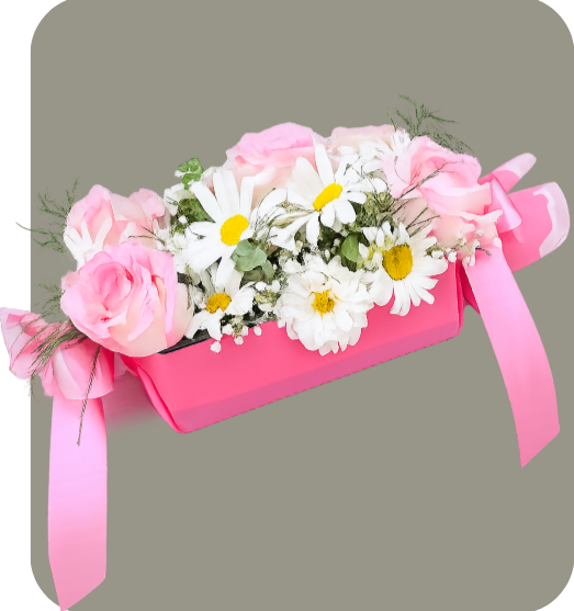 Arreglo floral horizontal en forma de dulce con rosas rosadas, margaritas blancas y delicados follajes.