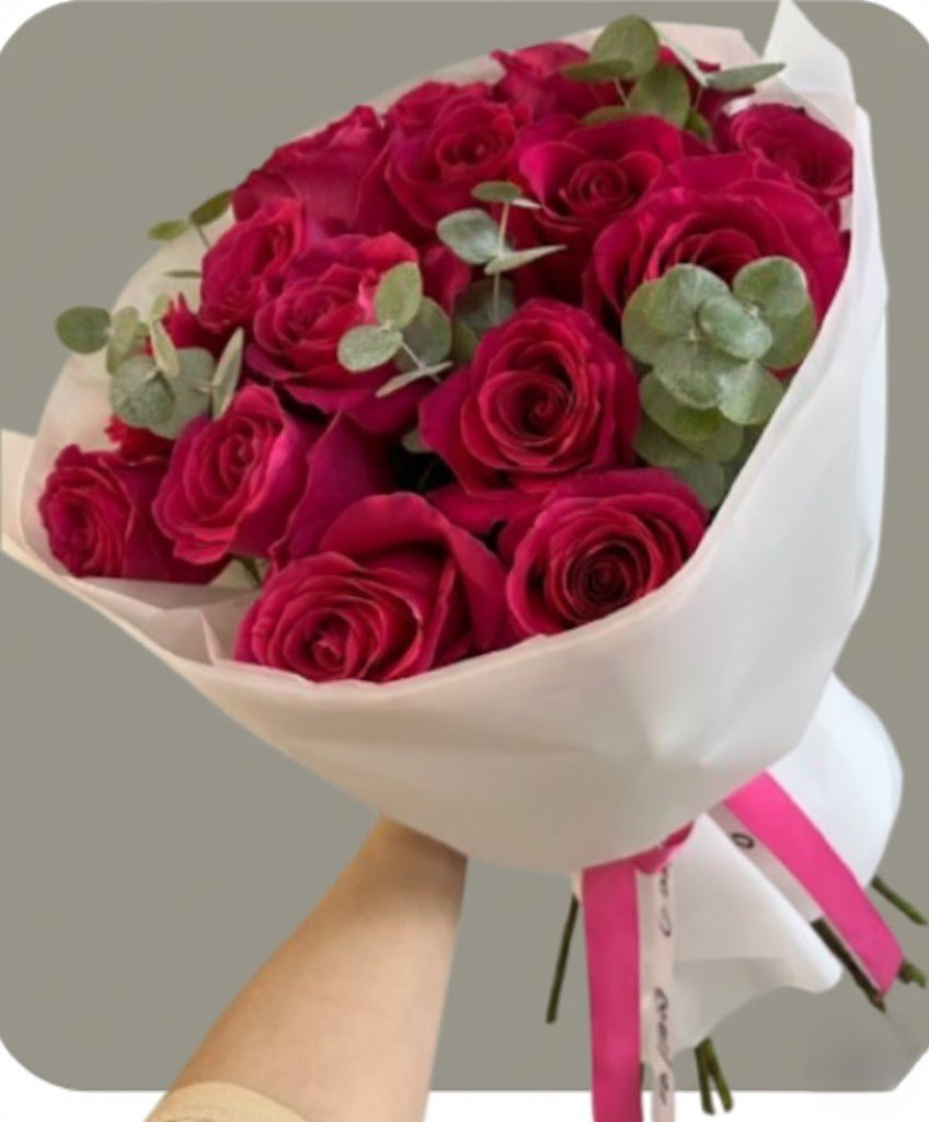Un elegante ramo de rosas rojas vibrantes acompañadas de ramas de eucalipto fresco. Está envuelto artísticamente en papel coreano blanco y sujeto con un delicado lazo rosa. Una combinación moderna y romántica, ideal para un regalo sofisticado.