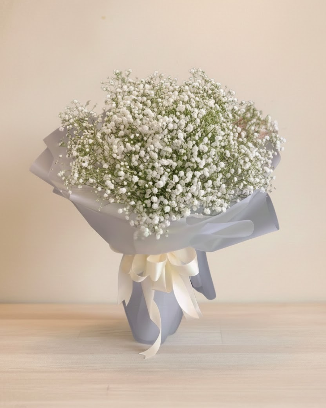 Este arreglo es una densa nube de nube blanca de chispas blancas. Está envuelto en un papel coreano, que aporta un toque minimalista y resalta la blancura de las flores. El diseño culmina con un lazo de listón satinado color crema, proporcionando un acabado limpio, elegante y monocromático a la presentación.