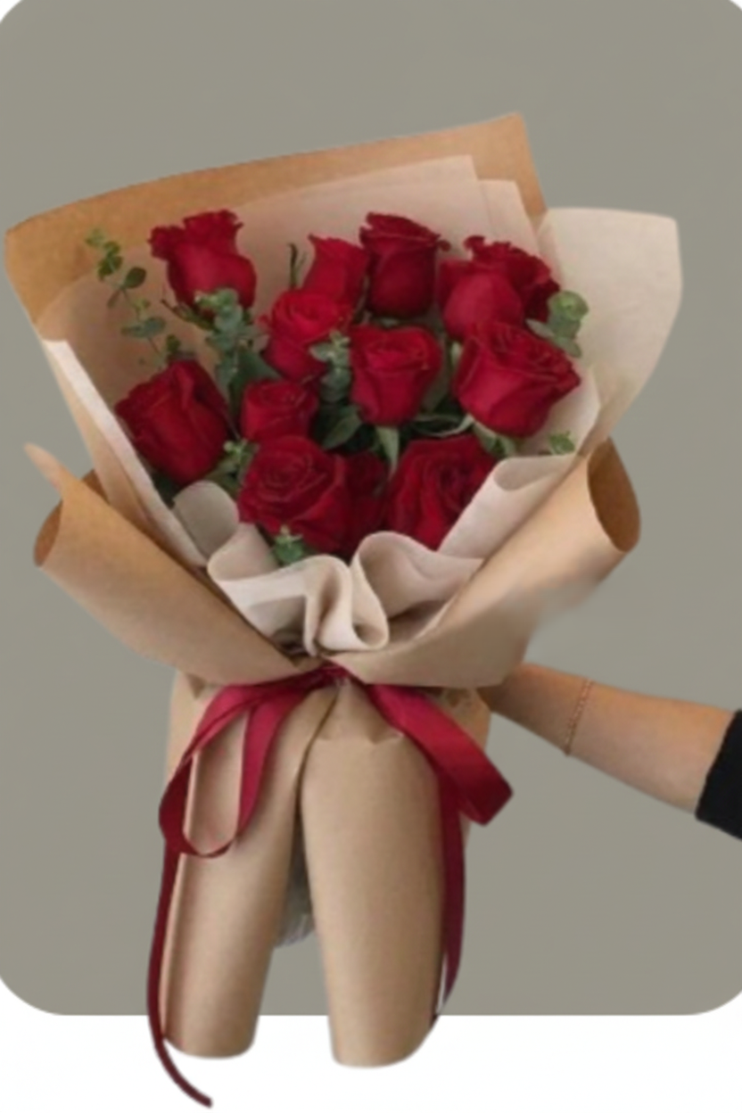 Ramo clásico de 12 rosas rojas intensas, que transmiten pasión y elegancia. Se complementa con follaje verde suave tipo eucalipto, aportando frescura y contraste natural.