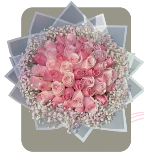 Este es un arreglo monocromático y majestuoso, compuesto por un denso ramo circular de rosas en diversos tonos de rosa, rodeadas por una delicada aureola de follaje de chispas rosas y blancas. El envoltorio presenta un papel coreano, que enmarca la composición con un estilo moderno y artístico. Es un diseño de gran volumen y delicadeza, ideal para celebrar un aniversario o un momento especial con un toque de lujo y romanticismo.